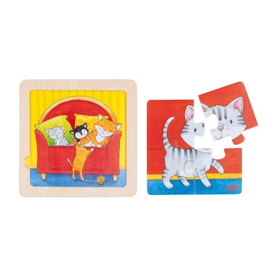 Puzzle bébé Chat Puzzle en bois Dim. du puzzle : 14 x 14 cm Dim. des pièces : environ 5,5 cm Age : à partir de 1 an et +